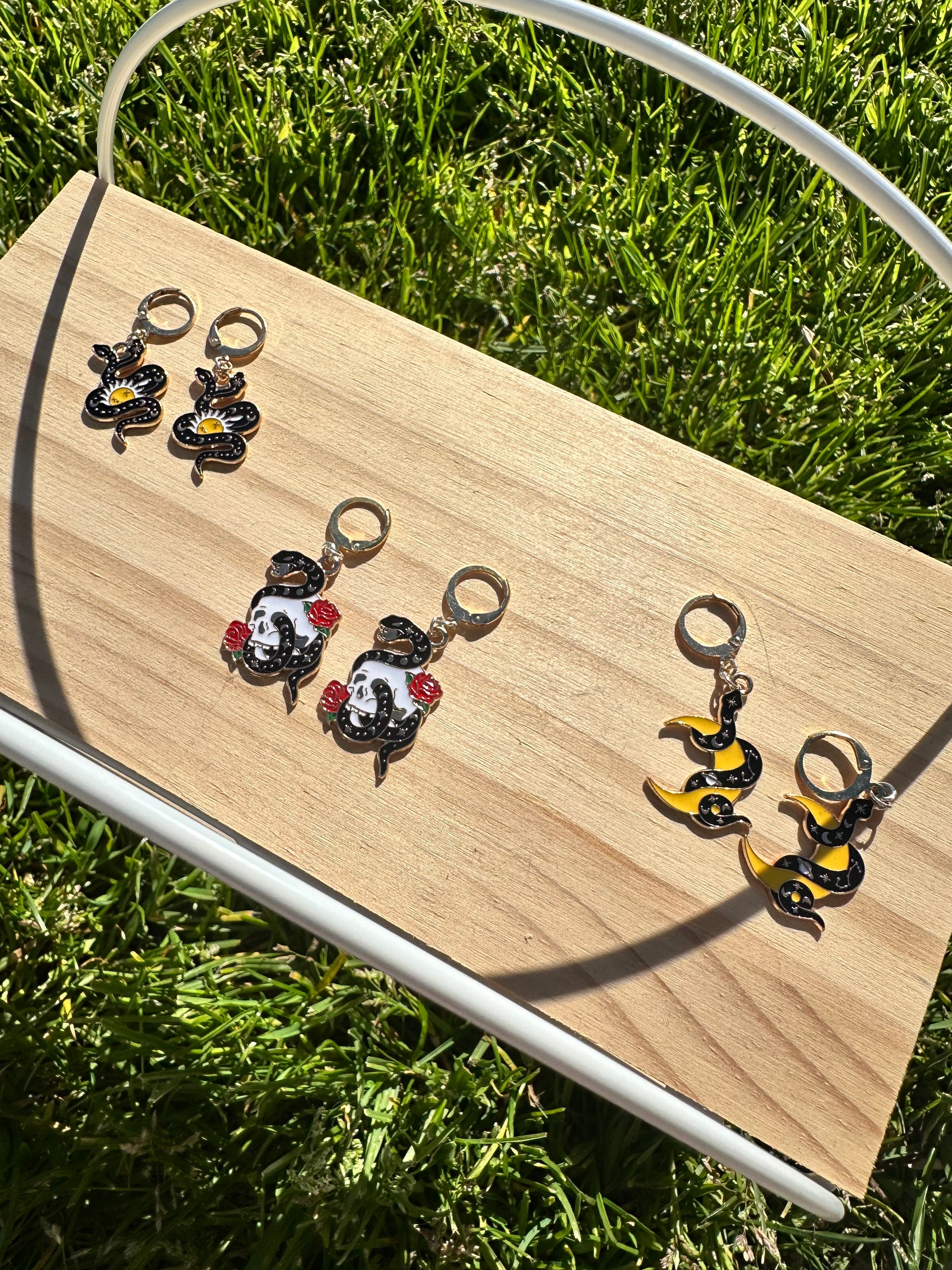 Enhance your edgy look with our snake earrings. These gothic-inspired pieces feature stunning stellar details for a unique touch. Designed to make a statement, these earrings are perfect for adding a touch of mystery and elegance to any outfit. Achieve a bold and confident look with these striking snake earrings.